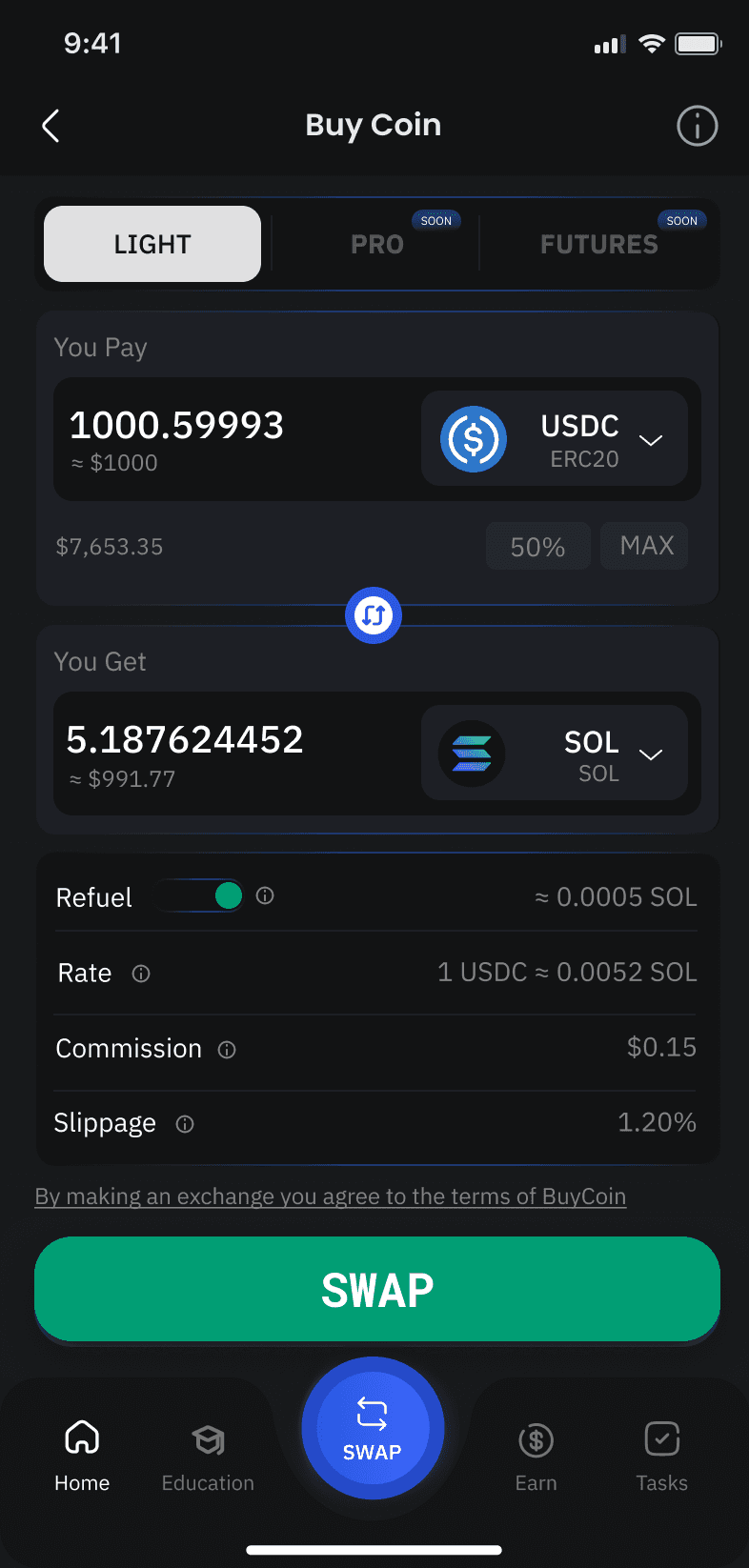 Swap USDС on Ethereum for SOL on the SOL network in one click